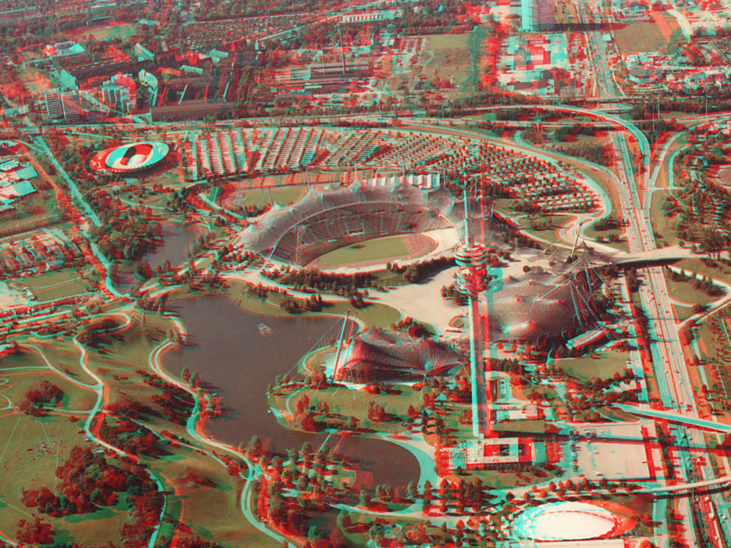 Anaglyphenbild: Luftbildaufnahme des Olympiageländes mit Fernsehturm in München