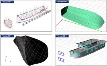 | | Robert McNeel & Associates | | Von links oben nach rechts unten: Ausrichtung der Konstruktionsspanten-Zeichnung für den Kurvenexport. Flächenanalyse des Bootrumpfes. Projizieren der Wasserlinien am temporären Vordersteven. Extrudieren und Trimmen der Deckhausseiten |
