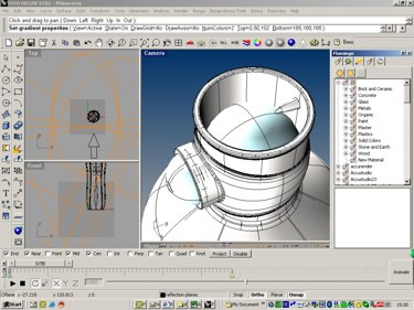 Zuweisung von Materialeigenschaften im Rahmen des Bildberechnungsprozesses. Hier: schattierte Darstellung. Im unteren Teil des Fensters ist die Zeitleiste des Animations-Programms Bongo zu sehen |