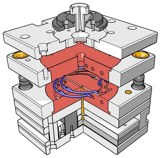 |  | Zudem kann RhinoMold auch branchenübliche 2D-Projekte mit standardisierten Anmerkungen realisieren, die bisher mit Rhinoceros noch nicht in vollem Umfang möglich waren. Neben Funktionen wie automatischer Elektrodenerzeugung, Anguss- oder Kühlkanalerzeugung verfügt das Plug-In auch über einen Modus zur Schrumpfberechnung und zur Berechnung der benötigten Materialmengen. Die vorinstallierte Normteil-Bibliothek stellt über 1800 Produkte des führenden Schraubenherstellers Hasco zur Auswahl, die direkt in den Werkzeugblock eingesetzt werden können. So entsteht ein Formaufbau mit dynamischer Voransicht und Dimensionierung.