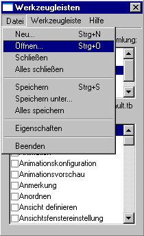 2. Im Fenster Werkzeugleisten gehen Sie ins Menü Datei/Öffnen...