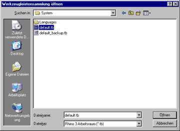 3. Öffnen Sie die Werkzeugleisten-Datei default.tb oder default.ws, welche sich im Rhinoceros-System-Ordner normal unter C:\Programme\Rhinoceros 3.0\System befindet.