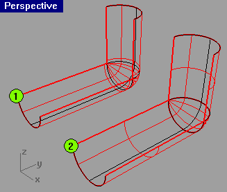 1. Verwendung von einer Leitkurve und 4 Querschnittkurven. Ergeniss: 1 Fläche