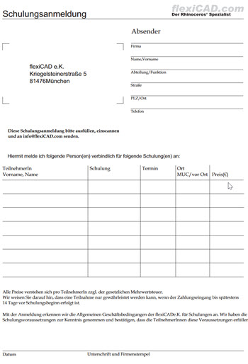 Wenn Sie sich für eine der Schulungen anmelden möchten, einfach nachfolgendes Formular ausfüllen, einscannen und an info@flexiCAD.com zurücksenden.